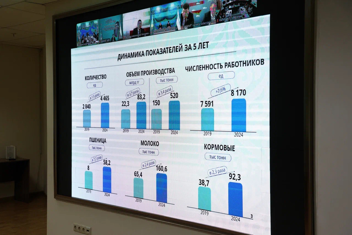 «За последние пять лет аграрный сектор продемонстрировал устойчивый рост ключевых показателей. Согласно представленным данным, с 2019 по 2024 год значительно увеличились объёмы производства, количество хозяйств и выпуск сельхозпродукции. Количество предприятий выросло с 2 840 до 4 465 единиц. При этом объем производства в денежном выражении увеличился с 22,3 миллиарда до 83,2 миллиарда тенге - рост в 3,7 раза. В натуральном выражении показатели также демонстрируют существенную динамику - с 150 тысяч тонн до 520 тысяч тонн», - заверил представитель ведомства.
