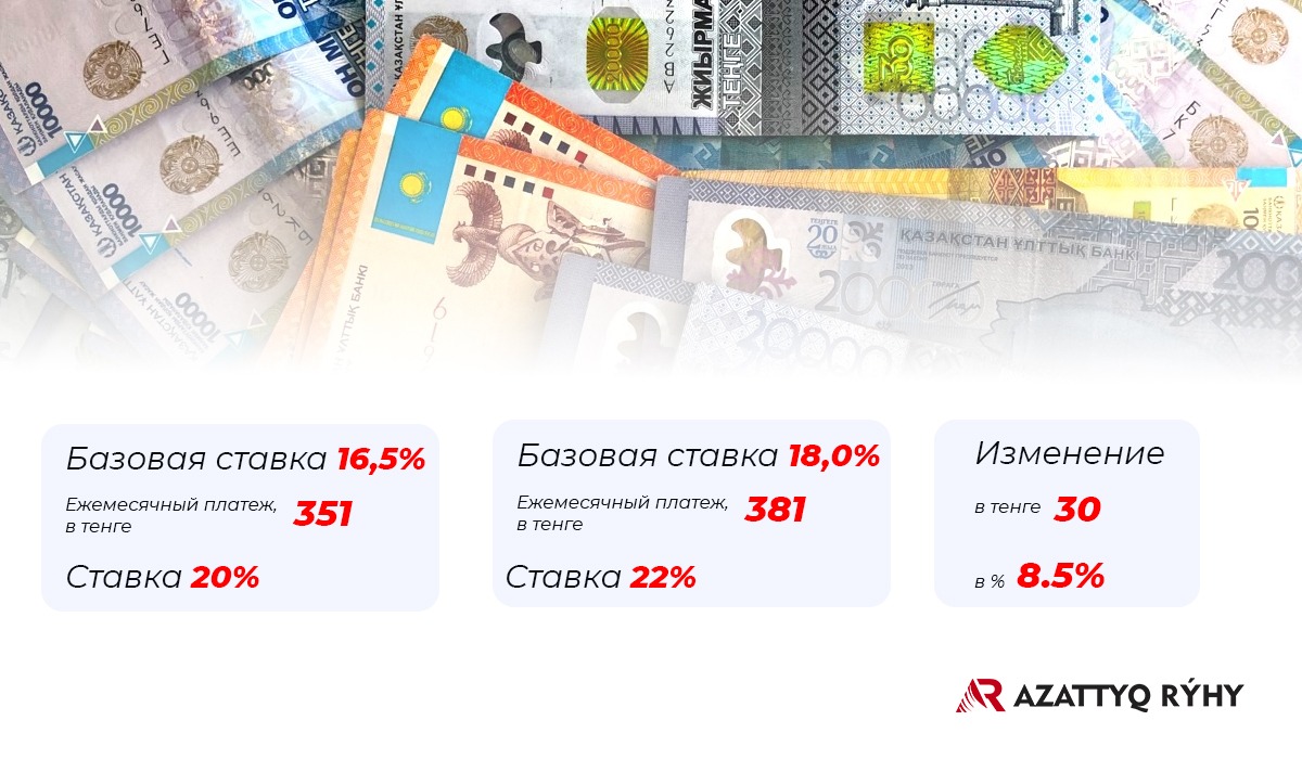 Эксперт привел пример: если взять займ 20 млн тенге на 15 лет при стоимости квартиры 25 млн тенге (первоначальный взнос 20%), то ежемесячный платеж вырос с 351 тыс. до 381 тыс. тенге. Это увеличение примерно на 8,5%.