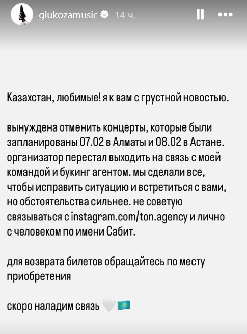Певица посоветовала поклонникам обращаться за возвратом билетов по месту их покупки. При этом Глюкоза выразила надежду, что в ближайшее время сможет вновь встретиться со зрителями в Казахстане.