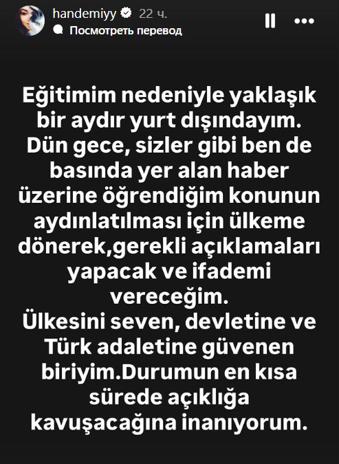 Звезда обратилась к поклонникам через сторис в Instagram. По словам Эрчел, около месяца она находилась за границей в связи с учебой, а о судебном решении узнала из новостей вместе со всеми.