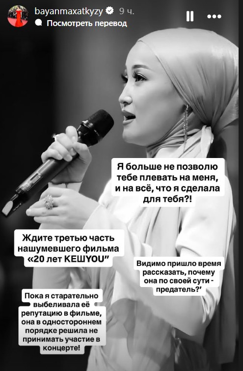 «Я больше не позволю тебе плевать на меня и на все, что я сделала для тебя! Ждите третью часть нашумевшего фильма «20 лет KeshYOU». Пока я старательно выбеливала ее репутацию в фильме, она в одностороннем порядке решила не принимать участие в концерте! Видимо, пришло время рассказать, почему она по своей сути – предатель?» – написала Баян Алагузова.