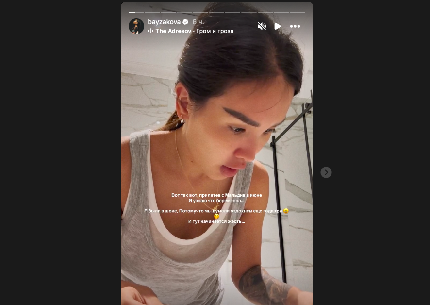 «Прилетела с Мальдив и узнала, что беременна. Я была в шоке, потому что мы думали отдохнуть ещё года три», — рассказала Байзакова.