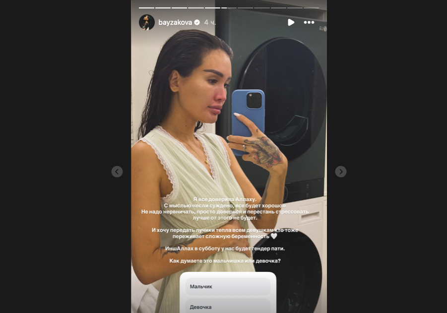 Сейчас Байзакова чувствует себя лучше. У неё уже 20 недель беременности, и пара готовится к гендер-пати, которое состоится в ближайшую субботу.