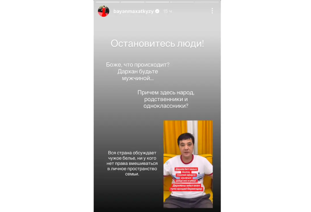 «Остановитесь, люди! Боже, что происходит? Дархан, будьте мужчиной... Причём здесь народ, родственники и одноклассники? Вся страна обсуждает чужое бельё, ни у кого нет права вмешиваться в личное пространство семьи», — написала продюсер.