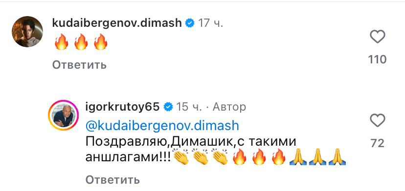 71-летний музыкант опубликовал в своём Instagram отрывок новой композиции под названием «Зонтик». Под постом Крутого Димаш Кудайберген, которому 31 год, оставил три смайлика в виде огоньков. В ответ композитор трогательно поздравил исполнителя: