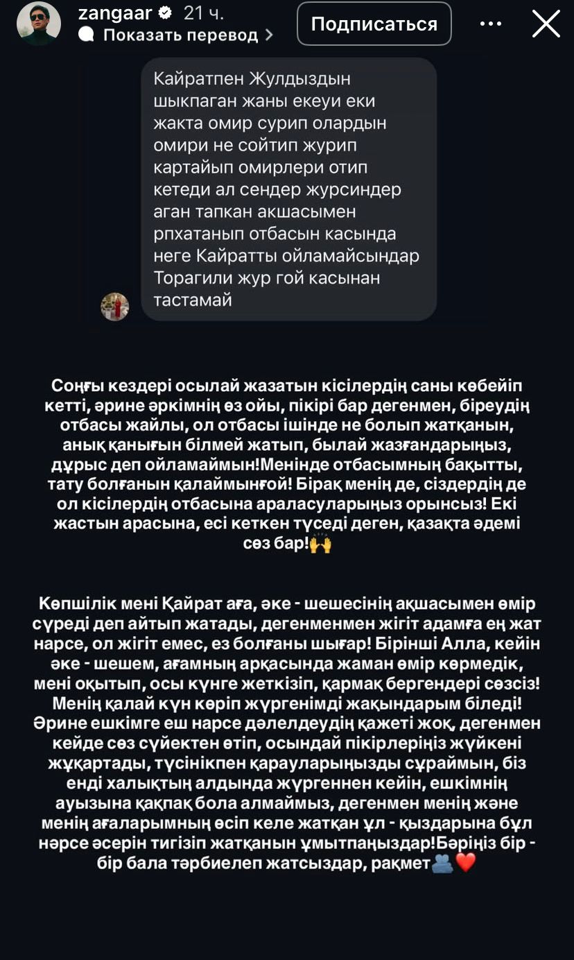 Младший брат известного певца Кайрата Нуртаса - Зангар - обратился к подписчикам, ответив на негативные комментарии в адрес своей семьи, передает Azattyq Rýhy.