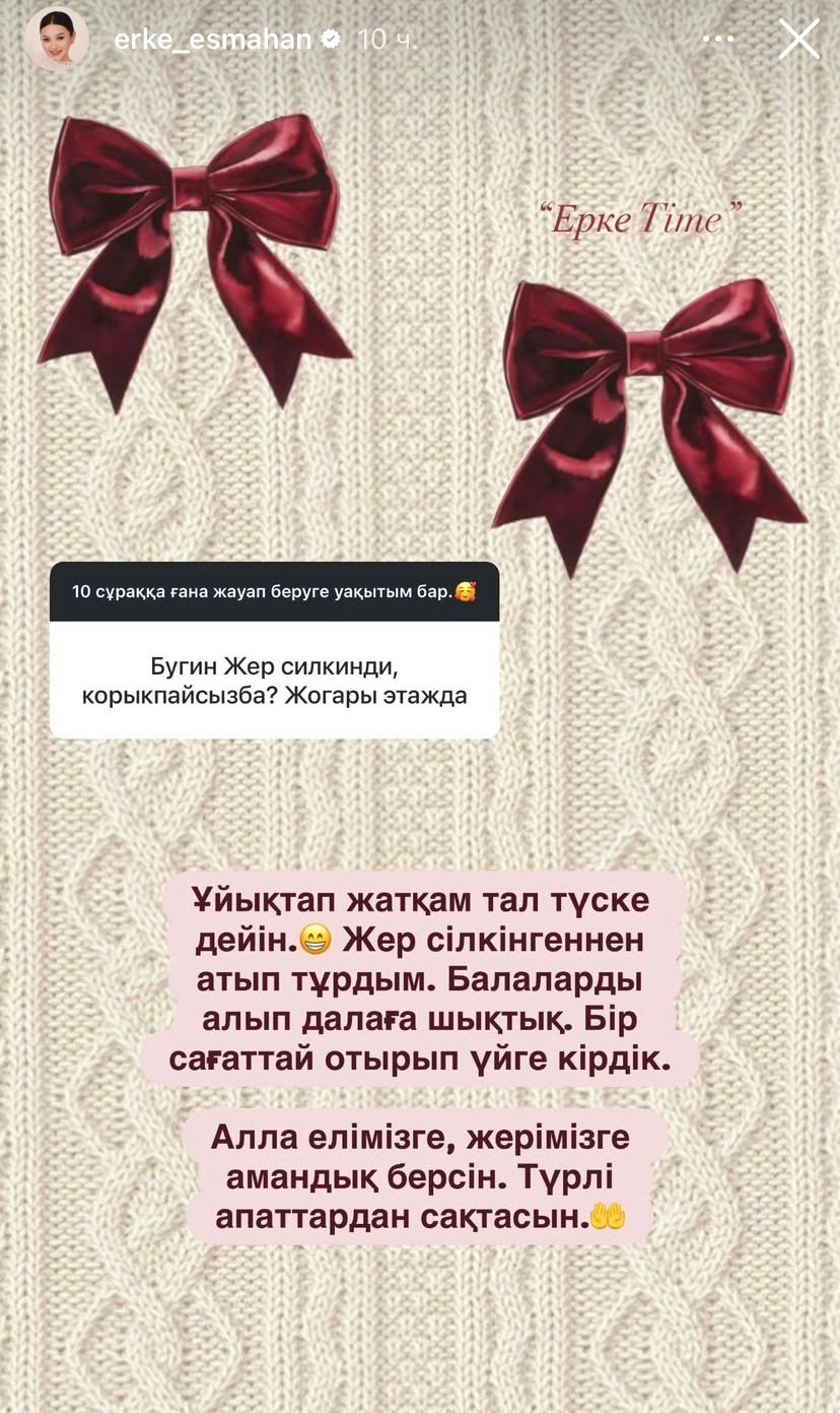 По словам артистки, подземные толчки застали ее врасплох. Одна из подписчиц поинтересовалась, не страшно ли певице жить на высоком этаже. Есмахан рассказала, что крепко спала до полудня, но внезапно проснулась от сильной вибрации.