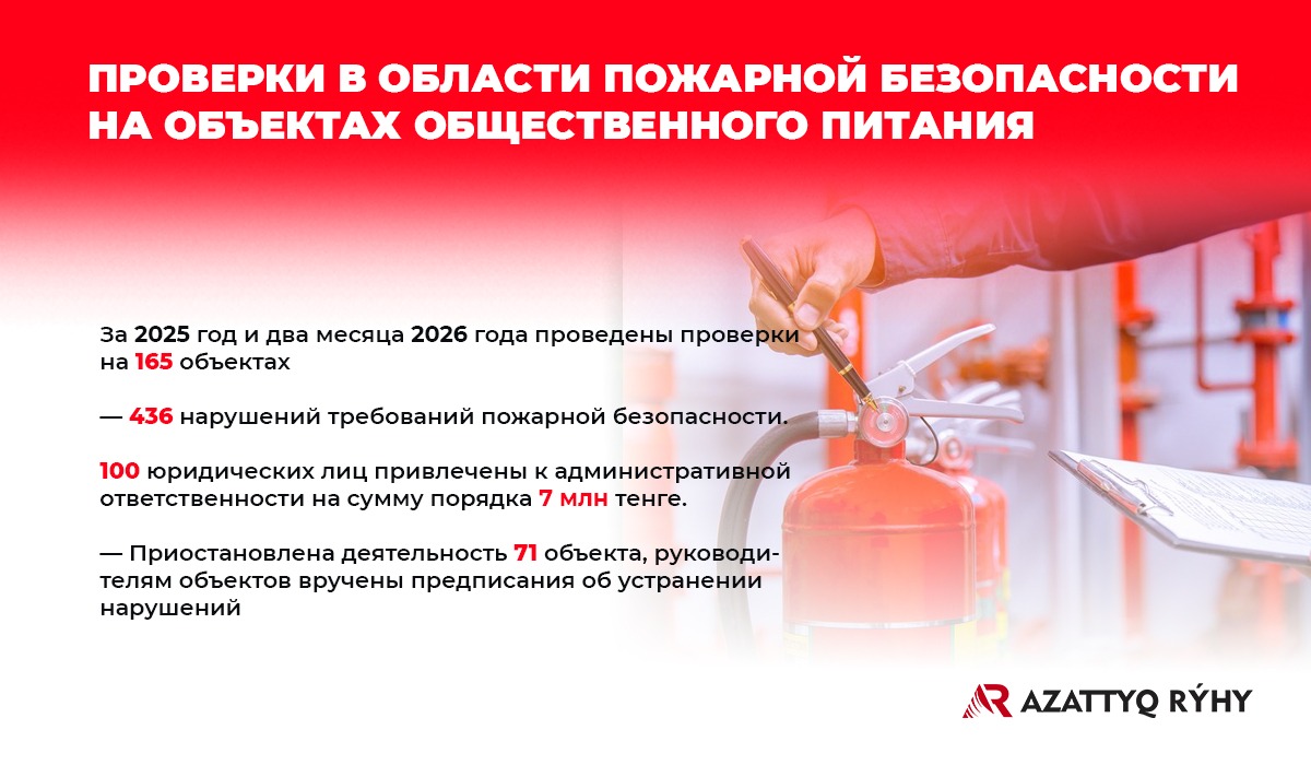 «За 2025 год и два месяца 2026 года проверки в области пожарной безопасности проведены на 165 объектах общественного питания. Выявлено 436 нарушений требований пожарной безопасности. К административной ответственности привлечено 100 юридических лиц на сумму порядка 7 млн тенге. Мерами оперативного реагирования приостановлена деятельность 71 объекта, руководителям объектов вручены предписания об устранении нарушений», - говорится в ответе вице-министра по ЧС Рамиля Камалова.