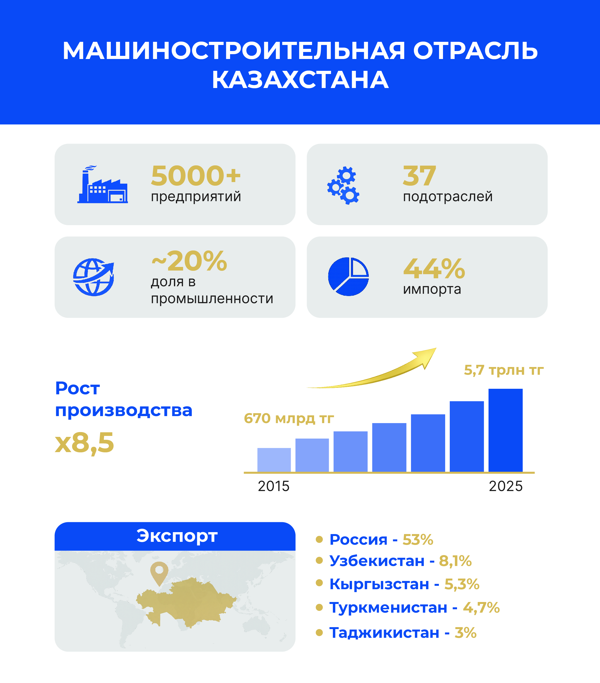 На этом фоне динамика казахстанского машиностроения за последнее десятилетие выглядит по-настоящему впечатляюще. По данным Союза машиностроителей Казахстана, к 2025 году совокупный объем производства достиг исторического максимума - 5,7 трлн тенге. Рост в 8,5 раза за десять лет - цифра, которая говорит о структурном преобразовании отрасли. Сегодня машиностроение формирует почти 20% обрабатывающей промышленности страны, уверенно закрепившись в числе ключевых секторов национальной экономики.