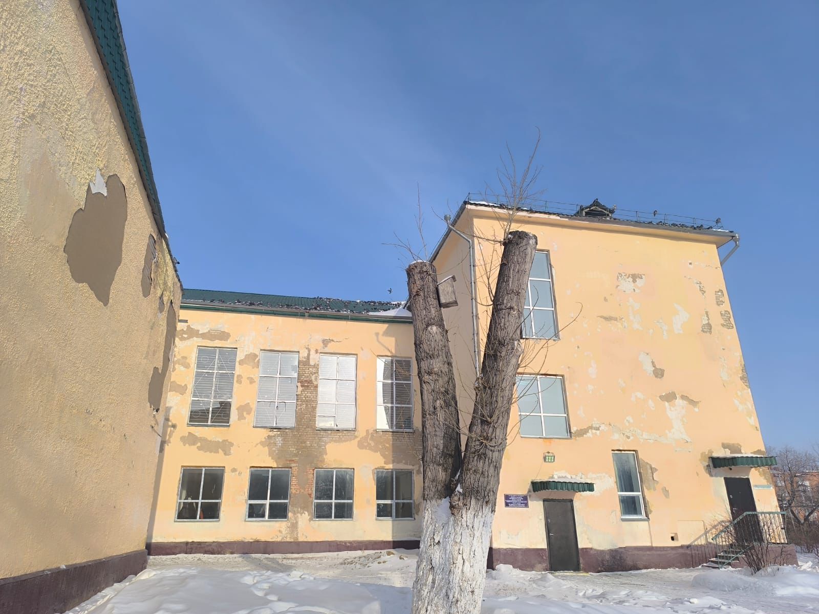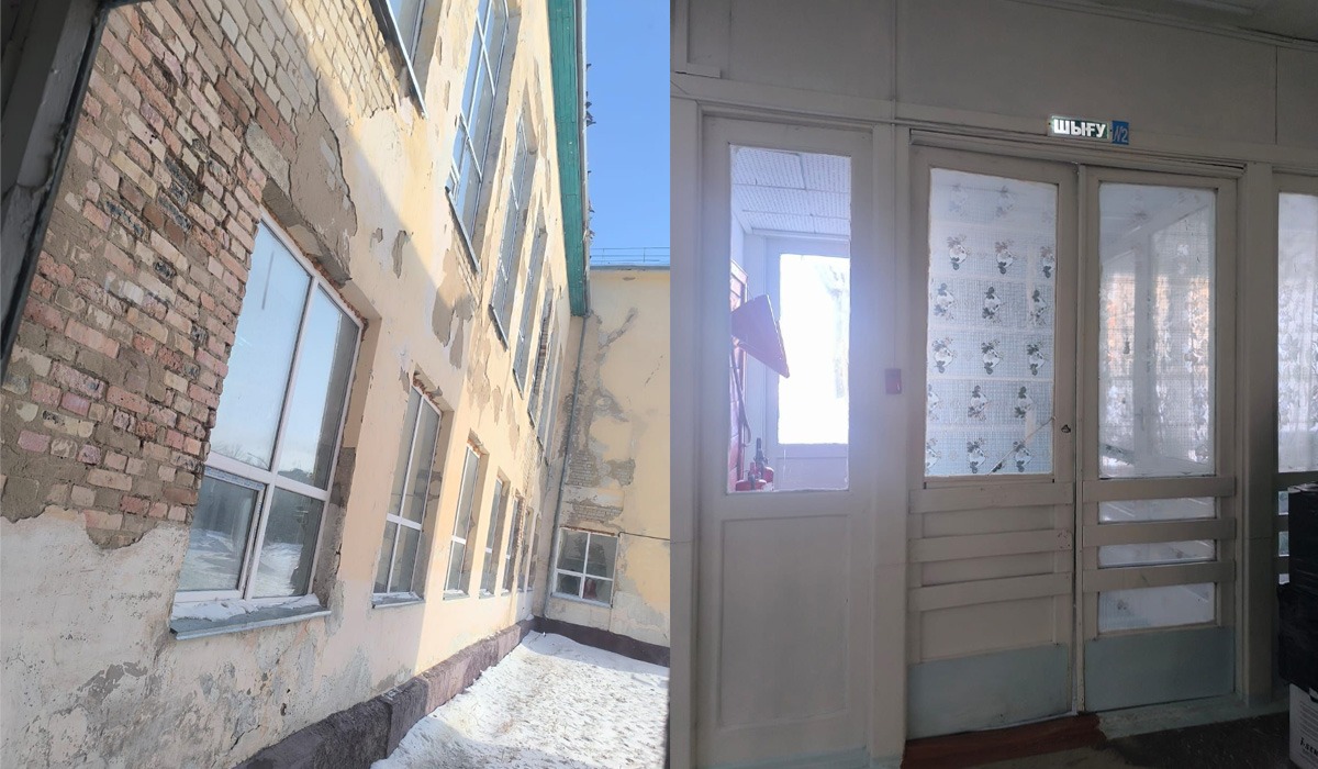 Кадры изнутри и снаружи нам показали родители учащихся. Их сделали родители уже после ремонта от акимата. Школа действительно выглядит как здание, давно оставшееся без должного ухода: штукатурка местами полностью осыпалась, обнажив старый, потемневший кирпич. По стенам тянутся глубокие трещины, а куски облицовки продолжают отваливаться. Видно, как фасад буквально крошится.