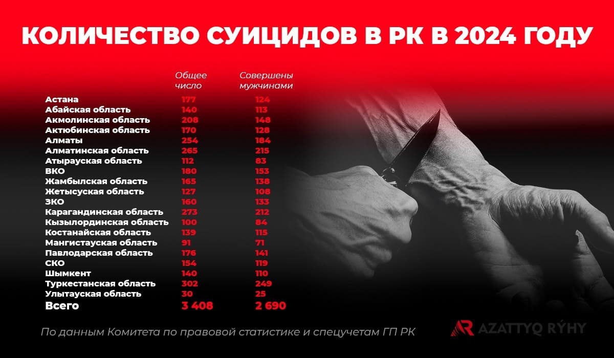В прошлом году было зарегистрировано 3 408 случаев самоубийства, и почти 80% от общего числа – 2 690 – совершены представителями сильного пола. Лидерами по числу трагедий стали Туркестанская, Карагандинская, Алматинская области, а также Алматы.