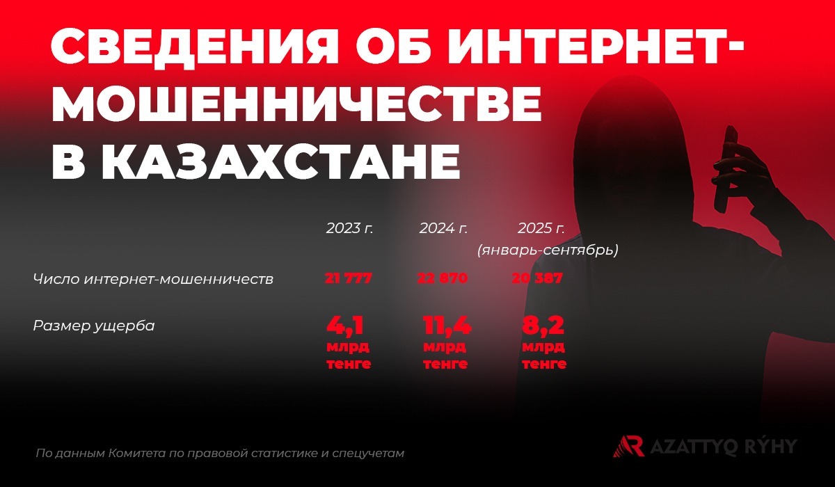 Официальная статистика весьма ярко демонстрирует активность онлайн-мошенников в Казахстане. В предыдущие годы в стране регистрировали немногим больше 20 тысяч преступлений. А цифры за 9 месяцев 2025-го выглядят пугающе – уже зафиксировано свыше 20 тысяч фактов обмана в сети. Это значит, что год вполне может закончиться с новым антирекордом. При этом финансовый урон от действий аферистов с каждым годом все ощутимее.