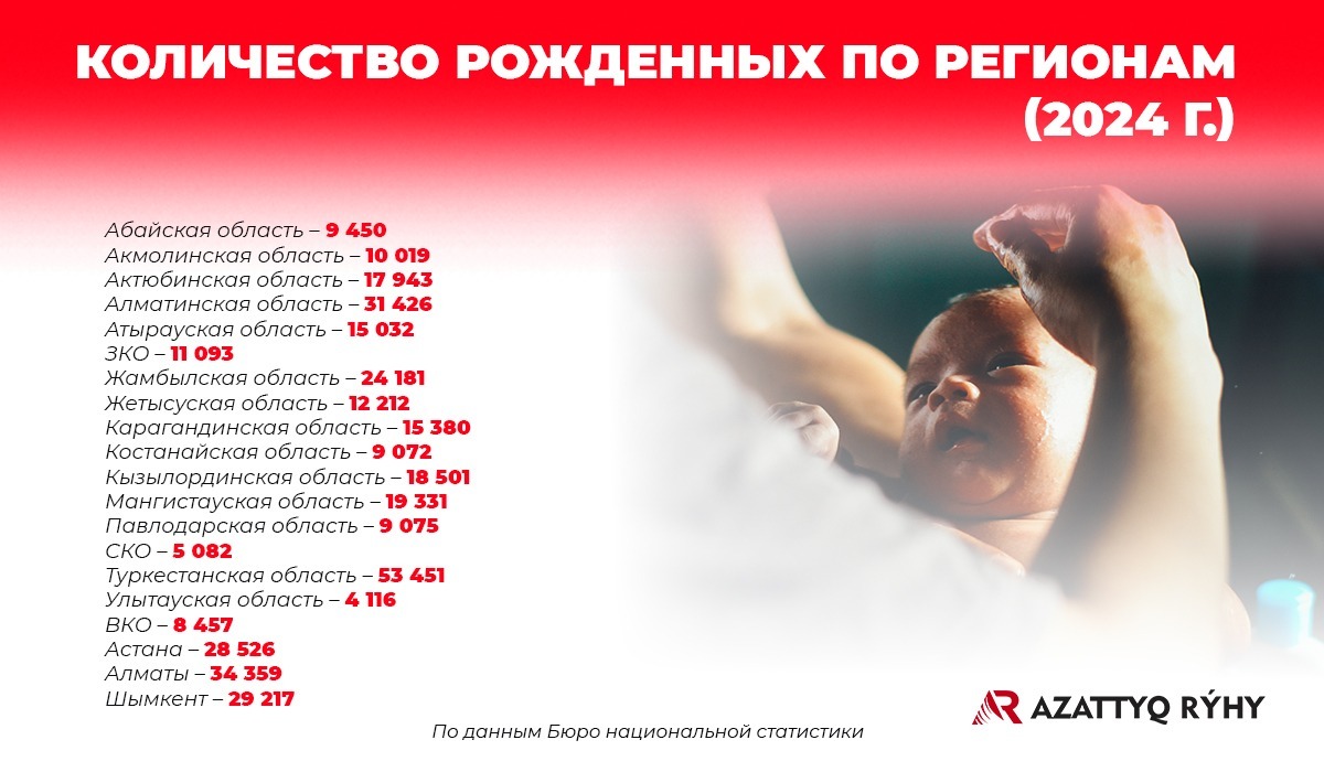 В статистике рожденных по регионам традиционно преобладают южные регионы. Больше всего малышей в прошлом году появились в Туркестанской, Алматинской областях и Алматы. Меньше всего маленьких казахстанцев родилось в области Улытау, Северо-Казахстанской и Восточно-Казахстанской областях.