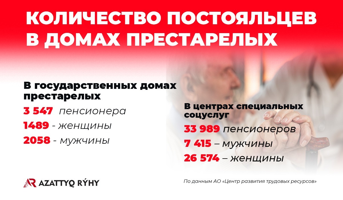 По данным Центра развития трудовых ресурсов, в Казахстане работают 45 государственных центров социального обслуживания – иначе говоря, домов престарелых. Сейчас в них коротают свои будни 3547 постояльцев. Больше всего таких домов в Восточно-Казахстанской, Карагандинской, Костанайской, Туркестанской и Жамбылской областях.