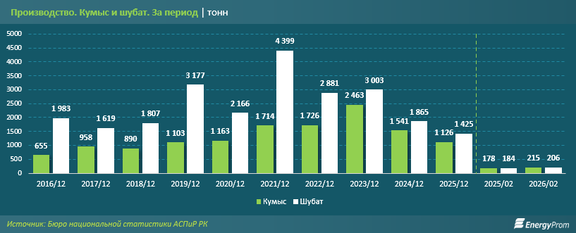 Данные за январь-февраль текущего года также указывают на сохраняющуюся нестабильность. Производство кумыса составило 215 тонн - на 20,8% больше, чем за аналогичный период 2025 года (178 тонн), однако все еще значительно ниже уровня января-февраля 2024-го (314 тонн). По шубату показатели остаются сдержанными: 206 тонн против 184 тонн годом ранее и 479 тонн два года назад. Это свидетельствует о частичном восстановлении, но без выхода на прежние объемы.