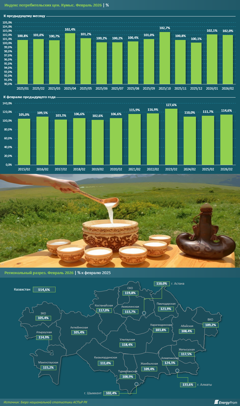 Особенно высокий интерес к кумысу и шубату традиционно наблюдается в период празднования Наурыз, когда эти напитки становятся важной частью праздничного стола. На этом фоне рост цен ощущается сильнее, а сами напитки становятся менее доступными, особенно в регионах с резким подорожанием.