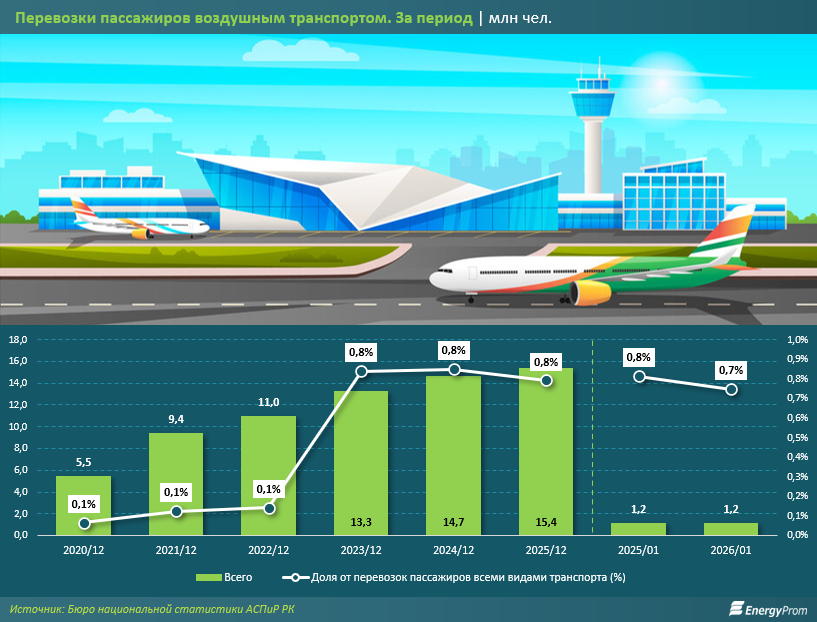 В 2025 году казахстанские авиаперевозчики обслужили 15,4 млн пассажиров. Показатель вырос на 4,8% за год и почти втрое превысил результаты кризисного 2020 года с его 5,5 млн пассажиров, передает Azattyq Rýhy со ссылкой на EnergyProm.