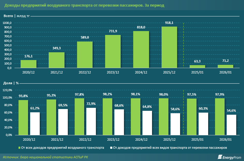 В январе текущего года доходы от авиаперевозок пассажиров составили 71,2 млрд тенге (в январе 2025-го - 63,3 млрд тенге), показав рост на 12,5%. Доля доходов авиации от всех доходов пассажирских перевозок при этом уменьшилась с 60,3% до 54,6%. Сокращение этой доли не свидетельствует об ослаблении позиций авиации, просто другие виды транспорта увеличивают доходы от перевозки пассажиров более быстрыми темпами.