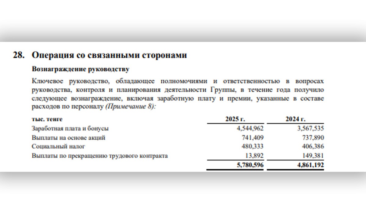 Вместе с тем, расходы на вознаграждение топ-менеджмента увеличились с 4,86 млрд до 5,78 млрд тенге. Основной рост пришелся на зарплаты и бонусы (с 3,56 млрд до 4,54 млрд тенге), премии IPO и долгосрочные планы поощрения (LTIP) также учтены, а стоимость распределенных акций сотрудникам составила 2,64 млрд тенге.