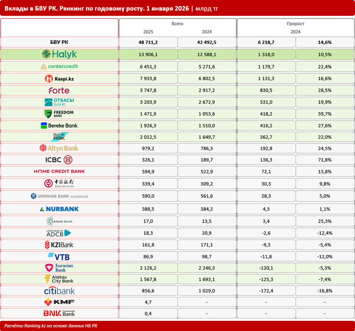 К началу 2026-го объём вкладов, сконцентрированных в казахстанских банках, достиг 48,7 трлн тенге - на 6,2 трлн тг (или на 14,6%) больше, чем годом ранее. В том числе 28,2 трлн тенге (или 58%) составили вклады физлиц, 20,5 трлн тенге (или 42%) - вклады юрлиц. Каким банкам свои сбережения доверяли больше всего казахстанцы, рассказали аналитики ranking.kz, передает Azattyq Rýhy.