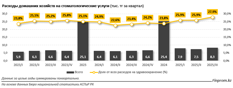 Показательна и динамика доли стоматологических расходов в общих затратах на здравоохранение: если в 2024 году она колебалась в пределах 22,6-24,2%, то летом 2025-го выросла до 27,9%. Это свидетельствует о том, что казахстанцы все активнее вкладываются в здоровье зубов, даже несмотря на существенные затраты.