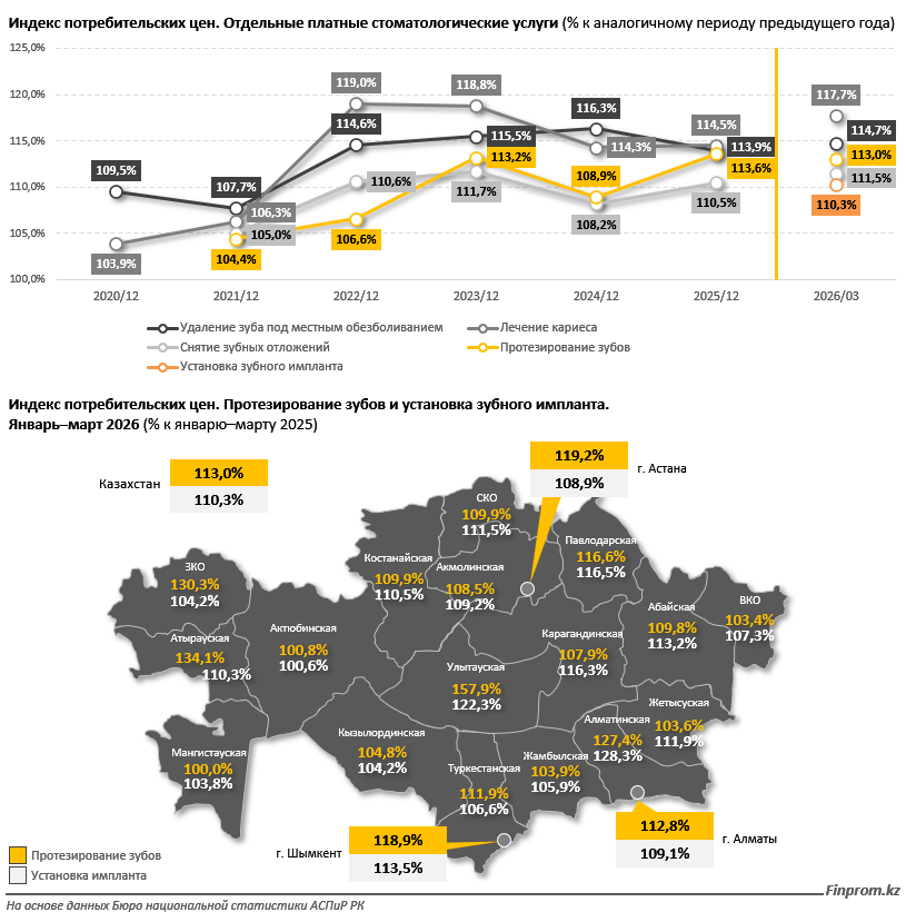 С начала 2026 года БНС начало публиковать данные по изменению стоимости услуг на установку зубных имплантов. В январе–марте цены выросли на 10,3% в годовом выражении. При этом в разных регионах темпы удорожания существенно разнятся: в Алматинской области имплантация подорожала на 28,3%, тогда как в Актюбинской - менее чем на 1%.