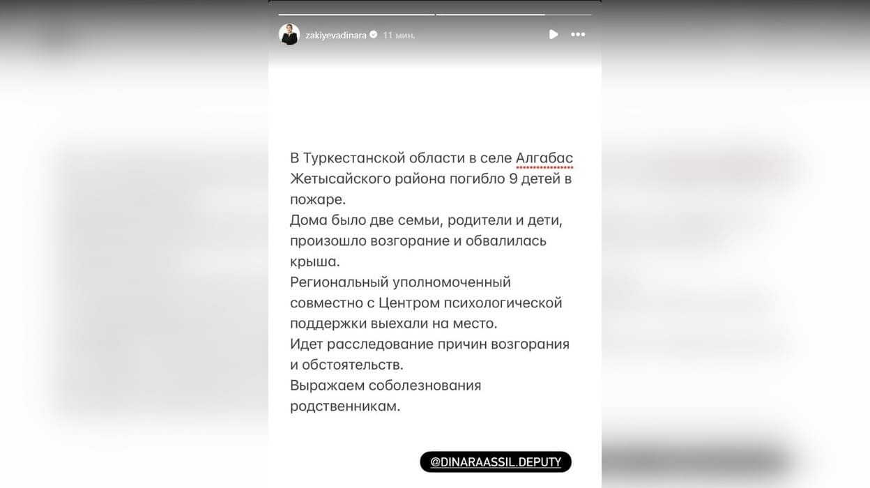 «Дома было две семьи, родители и дети, произошло возгорание, и обвалилась крыша. Региональный уполномоченный совместно с Центром психологической поддержки выехали на место. Идет расследование причин возгорания и обстоятельств. Выражаем соболезнование родственникам», – написала Динара Закиева в Instagram.