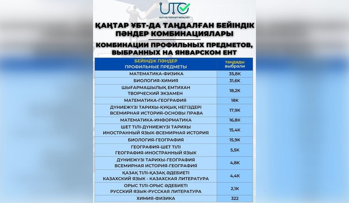 Национальный центр тестирования предоставил информацию о самых популярных комбинациях профильных предметов на январском Едином национальном тестировании 2026 года, передает Azattyq Rýhy.