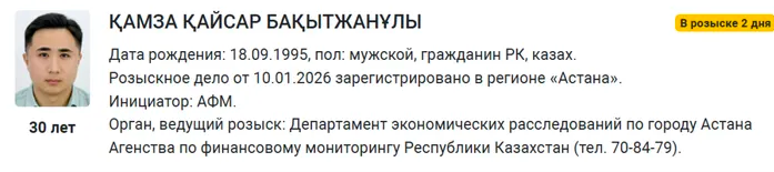 Согласно данным интернет-портала правовой статистики, розыскное дело в отношении Камзы Кайсара, 1995 года рождения, было зарегистрировано 10 января 2026 года в столице. Отмечается, что розыск продолжается уже второй день.
