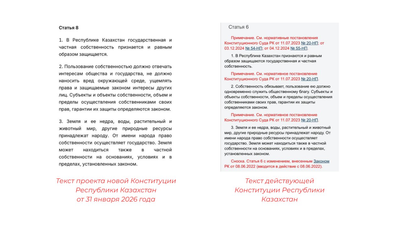 Как отмечается, формулировка, касающаяся земли и других природных ресурсов, осталась без изменений. В частности, положения статьи 6 пункта 3 действующей Конституции полностью идентичны нормам, закрепленным в проекте новой Конституции Республики Казахстан.