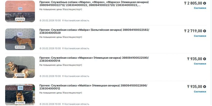 На портале электронных торгов «Е-казына» появились необычные лоты: в графе «Объект продажи» значатся не здания или техника, а живые существа — служебные собаки, честно отслужившие свой срок на охране государственной границы.