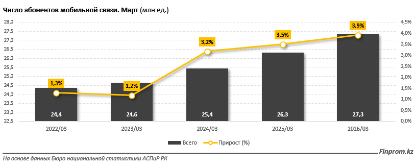 Мобильная связь давно вытеснила фиксированную телефонию и превратилась в полноценную цифровую экосистему. По данным на конец марта 2026 года, число абонентов в стране превысило 27 млн человек - за год прирост составил около 4%, а за пять лет - 14%, или 3,3 млн человек.