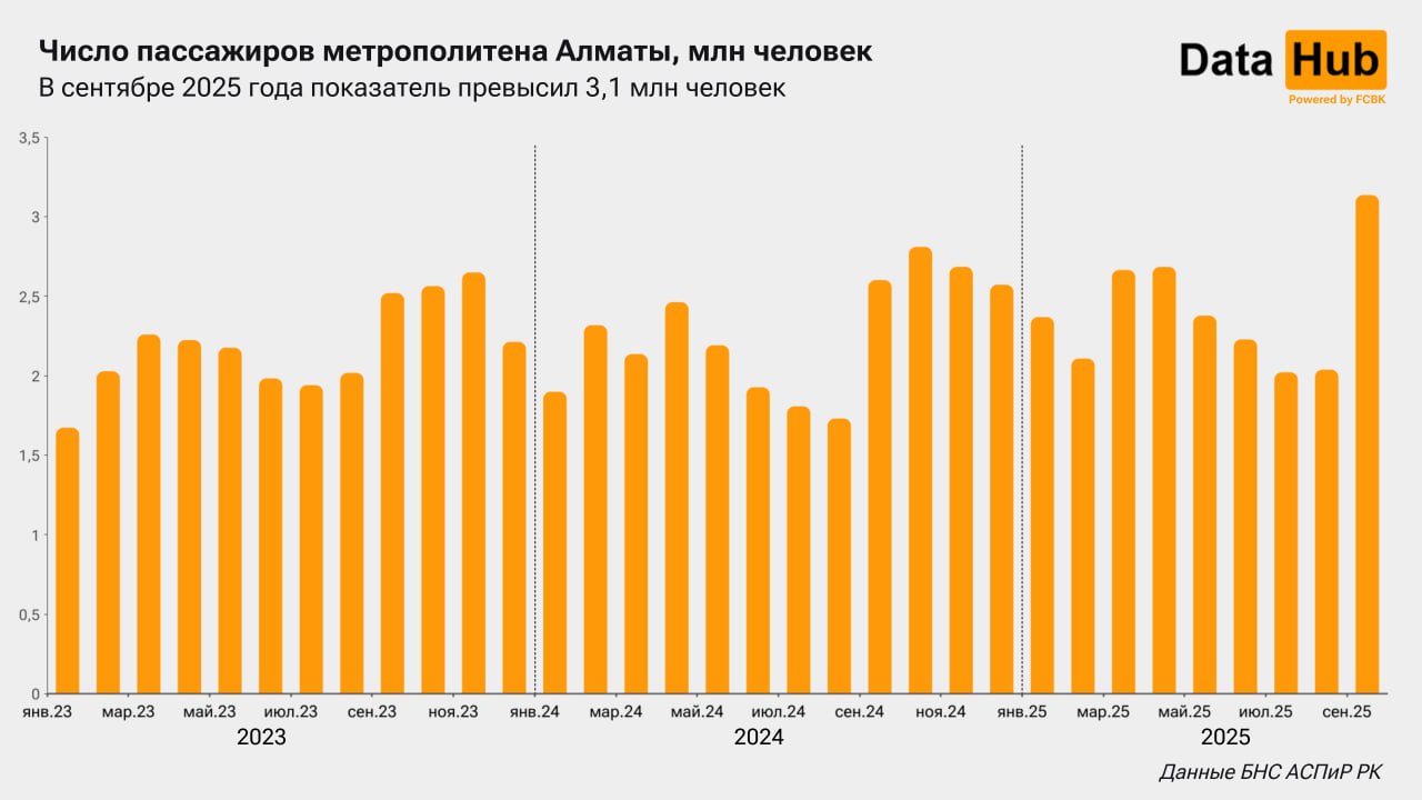 За сентябрь 2025 года алматинский метрополитен перевез свыше 3,1 млн пассажиров, что на 21% больше, чем за аналогичный период прошлого года, передает Azattyq Rýhy со ссылкой на Первое кредитное бюро.