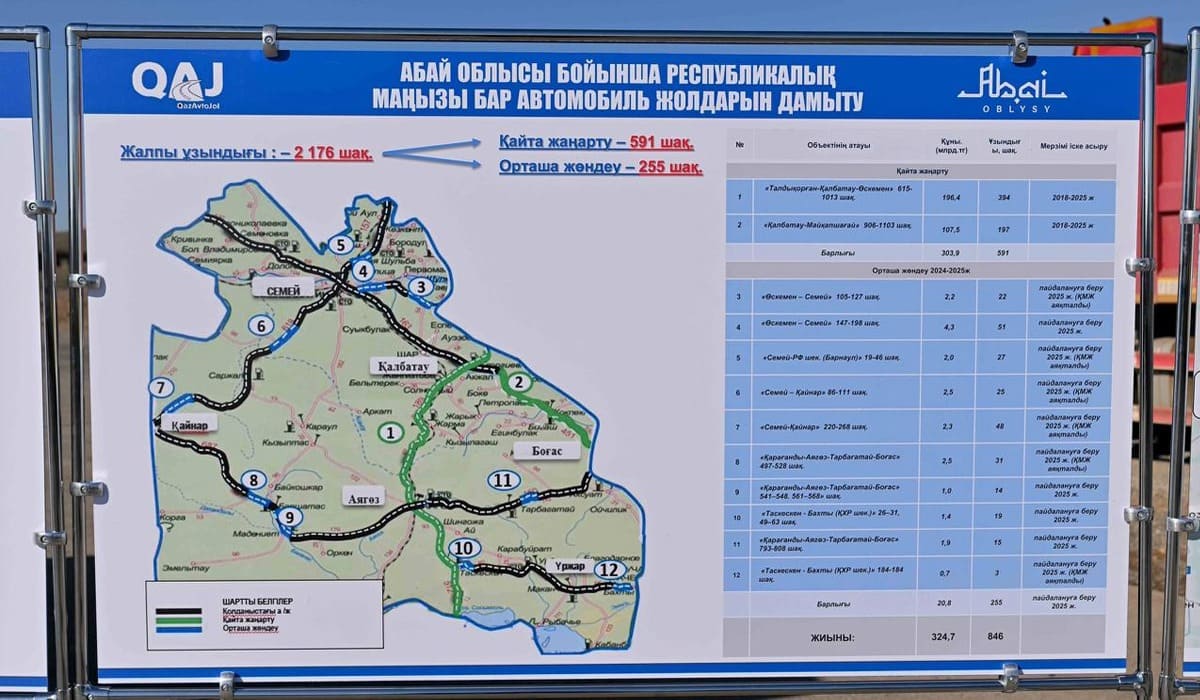 В этом году в области Абай также ведутся масштабные работы по развитию транспортной инфраструктуры. На ремонт и проектирование дорог местного значения и уличной сети населенных пунктов общей протяженностью 408 км выделены средства из бюджетов разных уровней. Ведутся работы на 7 участках областных дорог протяженностью 109 км, на 14 участках районных дорог протяженностью 130 км и на 63 км улиц в населенных пунктах в рамках программы «Ауыл – Ел бесігі». В Семее ремонтируется 52 улицы, в Курчатове – 42 км дорог.
