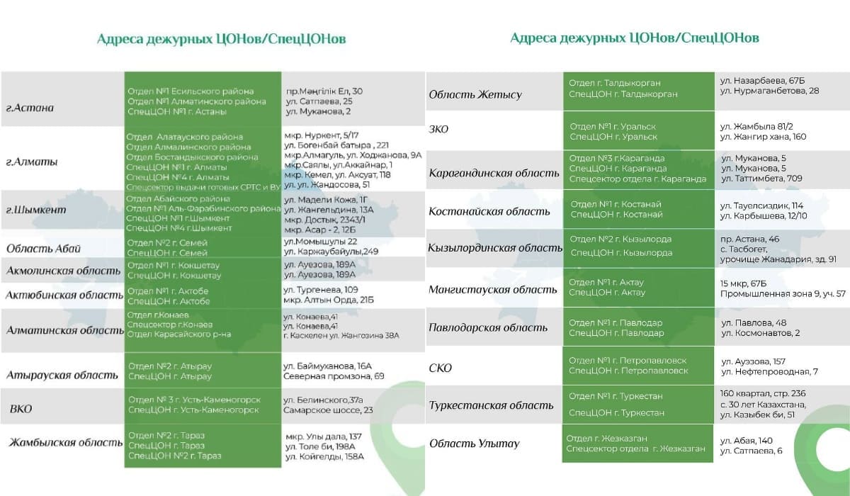 Адреса дежурных ЦОНов изменились в Астане и Алматы