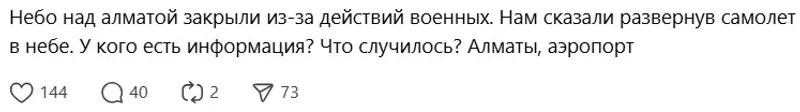 «Небо закрыли из-за действий военных. Нам сказали, развернув самолёт в небе. У кого есть информация? Что случилось? Алматы, аэропорт», - написал он.