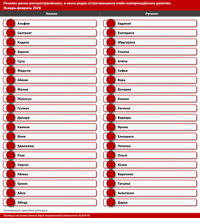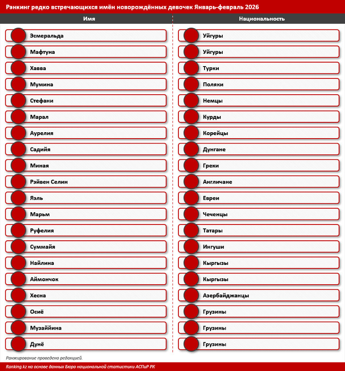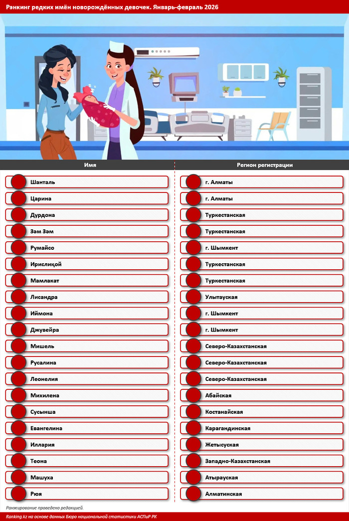 Бюро национальной статистики Казахстана опубликовало инструмент для анализа редких и популярных имён новорождённых. Ranking.kz выбрал 20 самых редких и красивых имён, зарегистрированных всего один раз за первые два месяца 2026 года, передает Azattyq Rýhy.