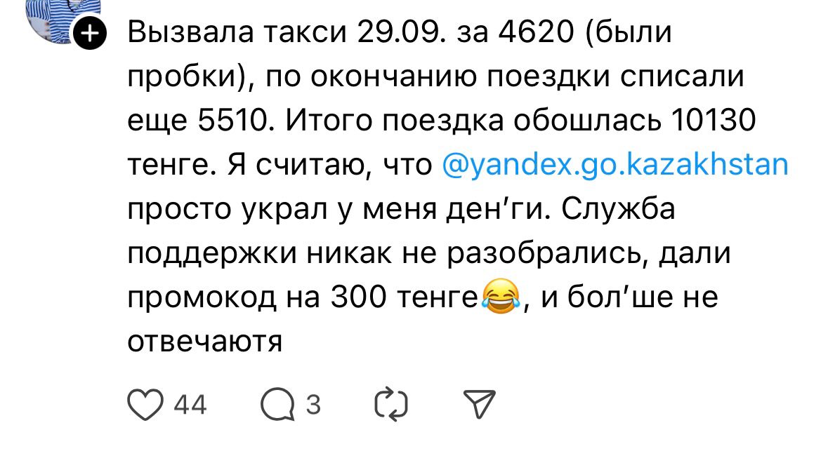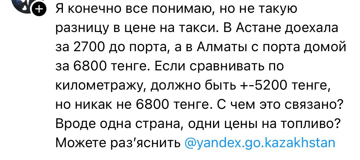 Стоит отметить, что часть вышеуказанных договоренностей явно не работают, как например, пояснение роста цены за поездку, детализация цены в приложении. О том информирует ли Яндекс агентство о повышении тарифов за три дня остается только гадать, а рост тарифов в два раза в условиях максимального спроса ничем не хуже повышения в три раза, особенно в городах республиканского значения как Астана и Алматы, где тарифы высокие и в хорошую погоду.