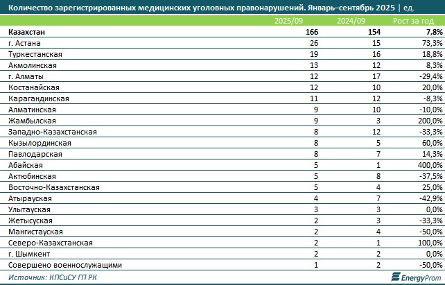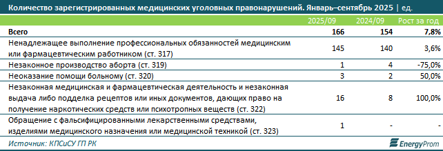 По итогам девяти месяцев 2025 года жертвами медицинских уголовных правонарушений в Казахстане стали 176 человек, против 162 годом ранее. Рост составил 8,6%, передает Azattyq Rýhy со ссылкой на Energyprom.kz.
