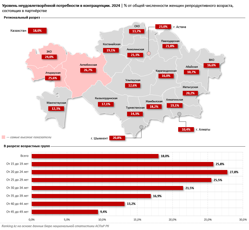 Особенно высокий уровень неудовлетворенной потребности наблюдается на западе страны: в Актюбинской области – 26,7%, в Атырауской – 25,6%, в ЗКО – 24%. Астана также вошла в число регионов с повышенными показателями – 23%.