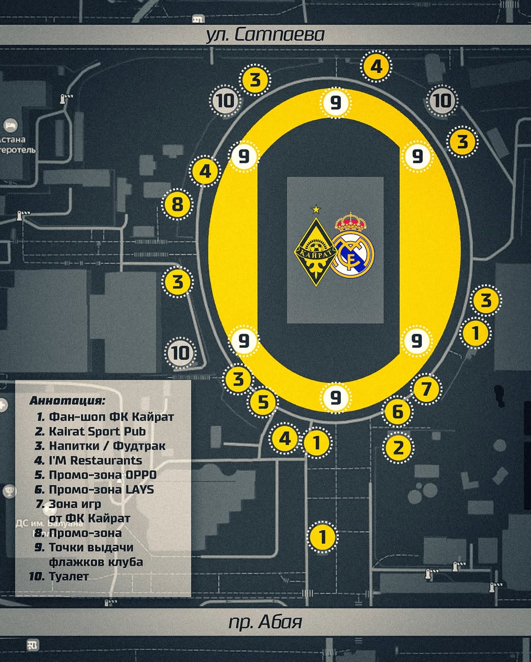 Футбольный клуб «Кайрат» сообщил подробности о том, что ожидает зрителей на долгожданном матче с мадридским «Реалом». Вход для болельщиков на территорию стадиона уже открыт с 17:45.