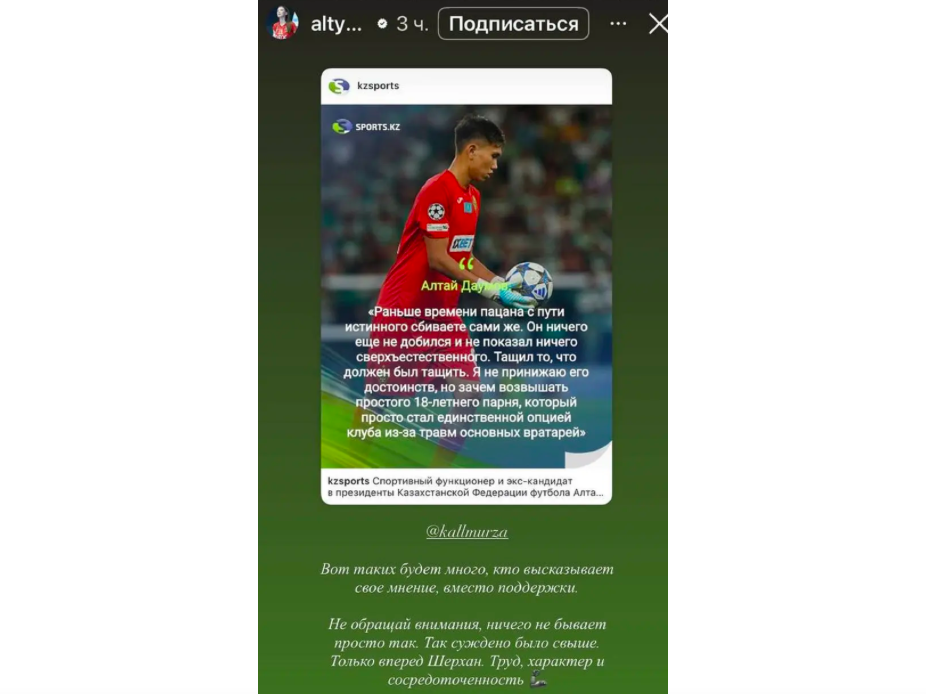 После публикации цитаты Алтынбекова обратилась к Калмурзе через социальные сети, подчеркнув важность поддержки молодых спортсменов и предостерегая от излишней критики на старте карьеры.
