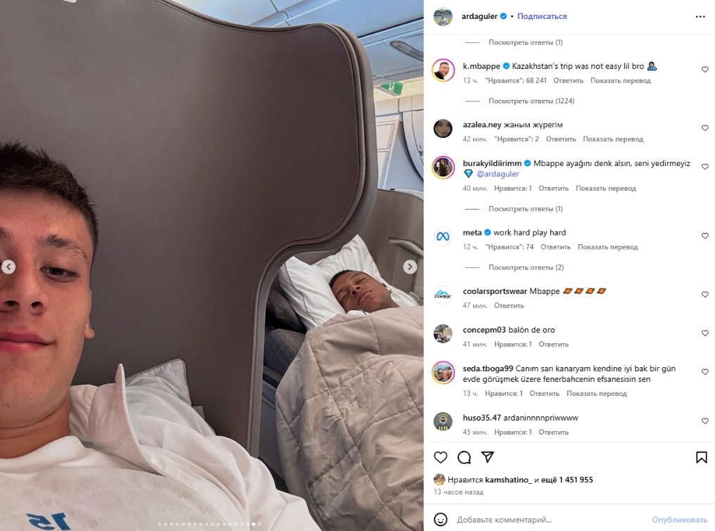 Турецкий полузащитник «Реала» Арда Гюлер опубликовал несколько кадров с перелета в Алматы перед матчем с казахстанским «Кайратом» в рамках Лиги чемпионов. На одном из снимков можно заметить спящего Килиана Мбаппе.