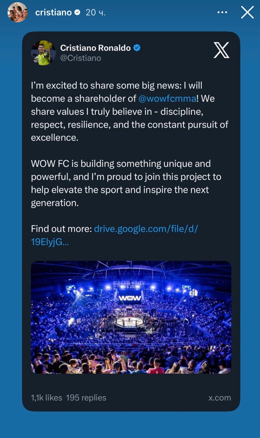 Генеральный директор WOW FC Артуро Гильен заявил, что участие Роналду станет важным толчком для развития промоушена. Лига была основана в Мадриде шесть лет назад и уже считается ведущей ММА-организацией в Испании.