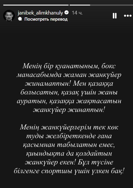 Казахстанский боксер Жанибек Алимханулы, оказавшийся в центре допинг-скандала, обратился к болельщикам и коллегам через свой Instagram, передает Azattyq Rýhy.
