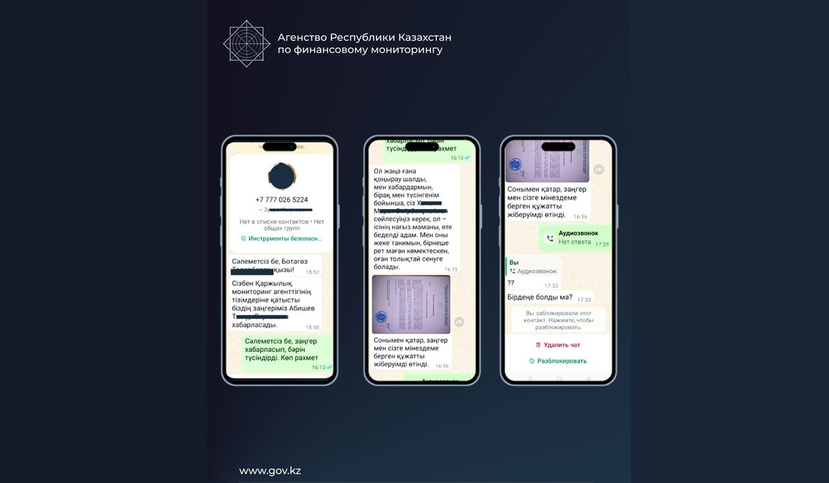 «Мошенники рассылают фальшивые письма якобы от имени АФМ, где говорится о «проверке в сотрудничестве с КНБ». Параллельно через WhatsApp начинают писать от имени руководителя и бухгалтера той же организации, где работает жертва, используя их реальные фотографии и имена на аватарках. Также мошенники ведут переписку и на государственном языке, что усиливает доверие и сбивает с толку», – сообщили в Агентстве.