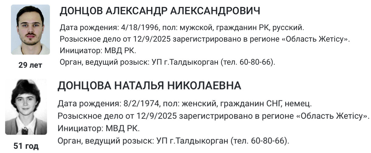 Ориентировка опубликована на интернет-портале правовой статистики Генеральной прокуратуры РК. В розыск были объявлены супруг погибшей экс-судьи - Александр Донцов и его мать - Наталья Донцова.